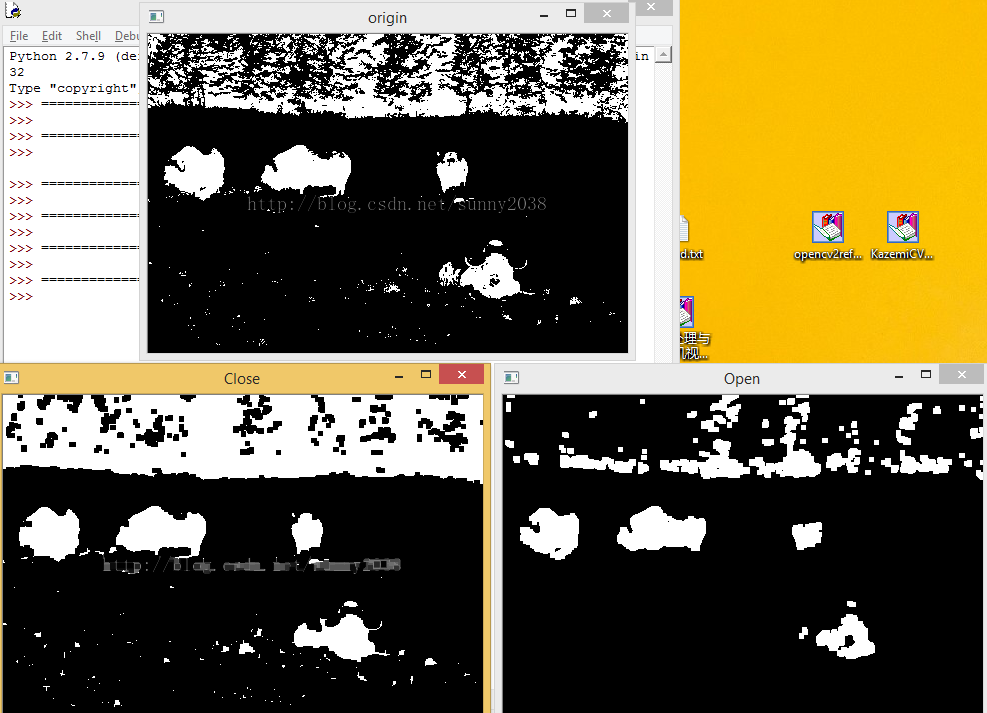 先腐蚀后膨胀的过程称为开运算。用来消除小物体、在纤细点处分离物体、平滑较大物体的边界的同时并不明显改变其面积。先膨胀后腐蚀的过程称为闭运算。用来填充物体内细小空洞、连接邻近物体、平滑其边界的同时并不明显改变其面积。(具体数学方面,参考具体的那篇)